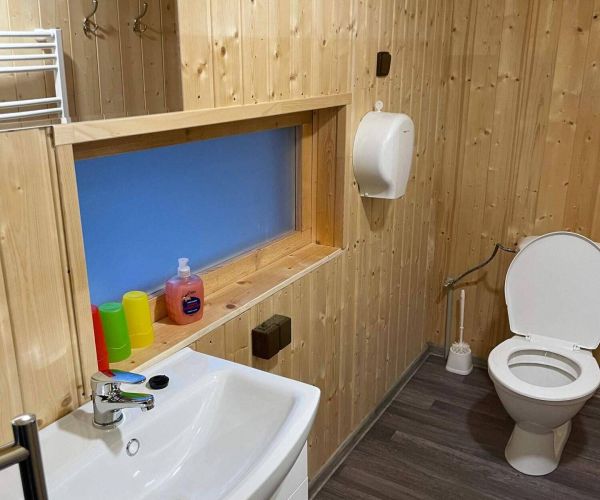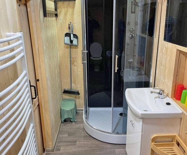 - Koupelna se sprchovým boxem, umyvadlem a WC