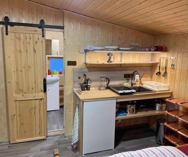 - Kuchyňský kout (lednice, sporák, dřez, rychlovarná konvice, nádobí, mikrovlnná trouba) a posezení v jedné místnosti